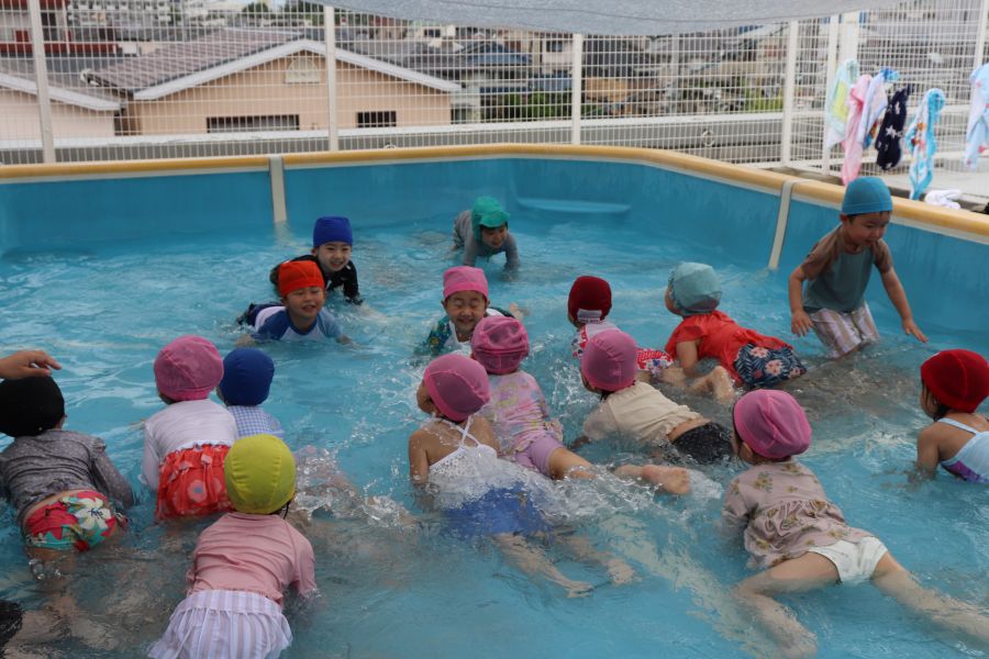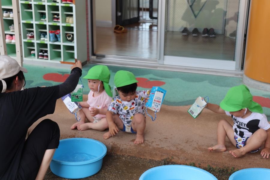 今日からプール開きでした♪ 午前中はなんとかお天気ももってくれたので 気持ちよく水遊びをすることが出来ました。 乳児さんはクラス前で手作りのおもちゃを使って 楽しく遊んでいましたよ♪