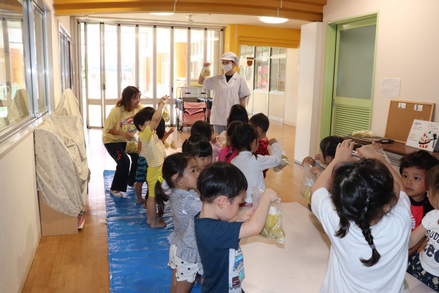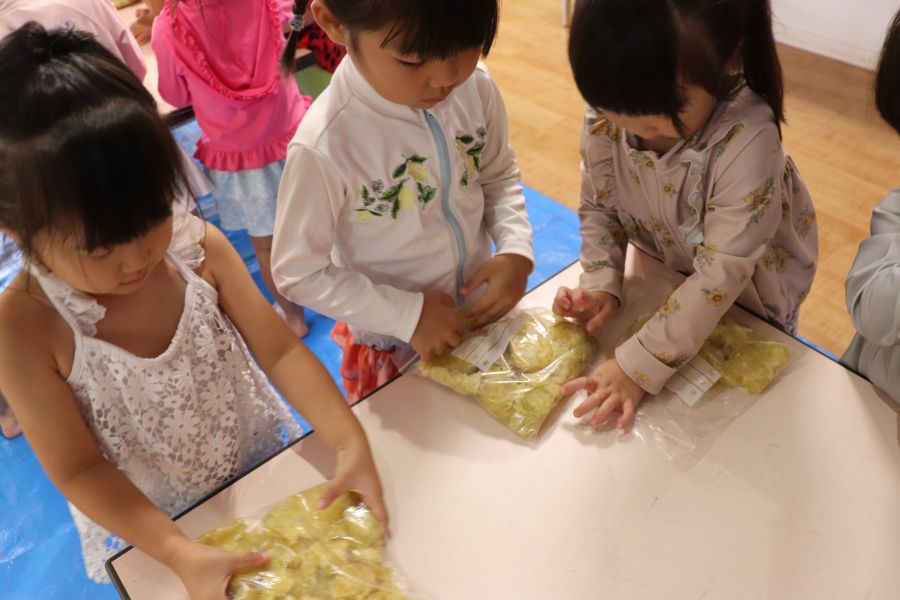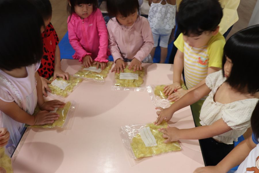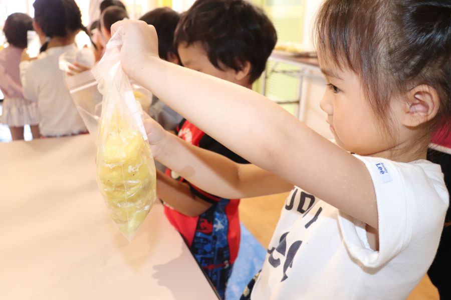 あおぐみさんがクッキングをしました! スイートポテトの材料になる蒸したサツマイモを密閉袋に入れて コネコネ・・・( ^ω^)・・・ 最初は「かたーい!」と言っていた子どもたちもコツをつかんで 上手につぶしていましたよ♪
