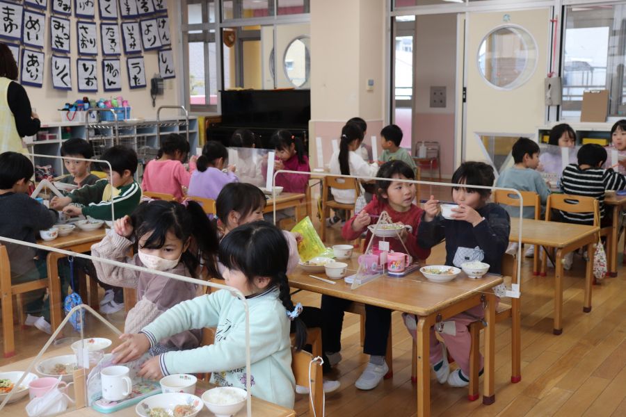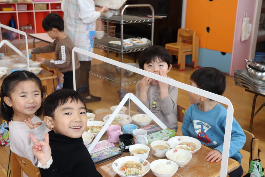 今日は朝から雨が降っていて、とても寒い日でしたが 子どもたちは温かくておいしい給食をニコニコ笑顔でたくさん食べていましたよ♪ 今日の献立は、ごはん、豚バラ大根、スパサラダ、すまし汁です。