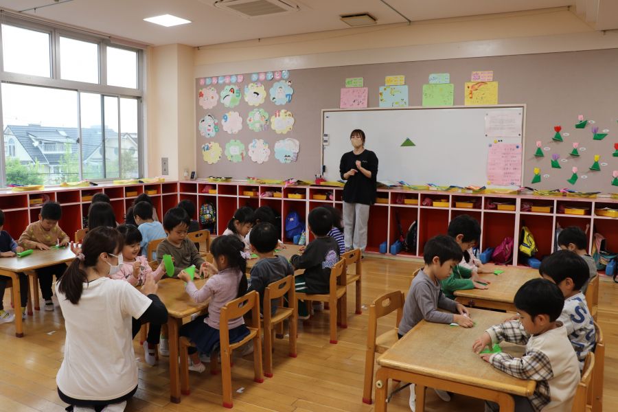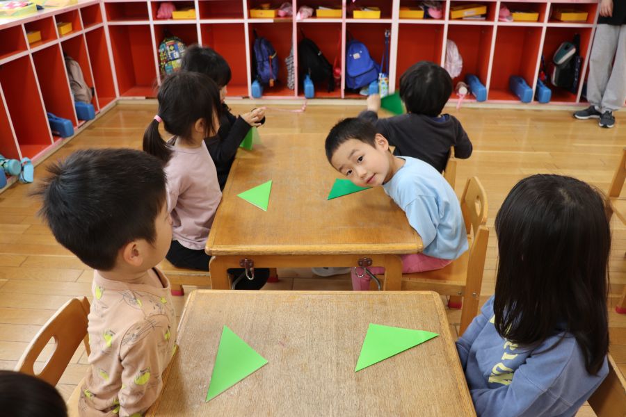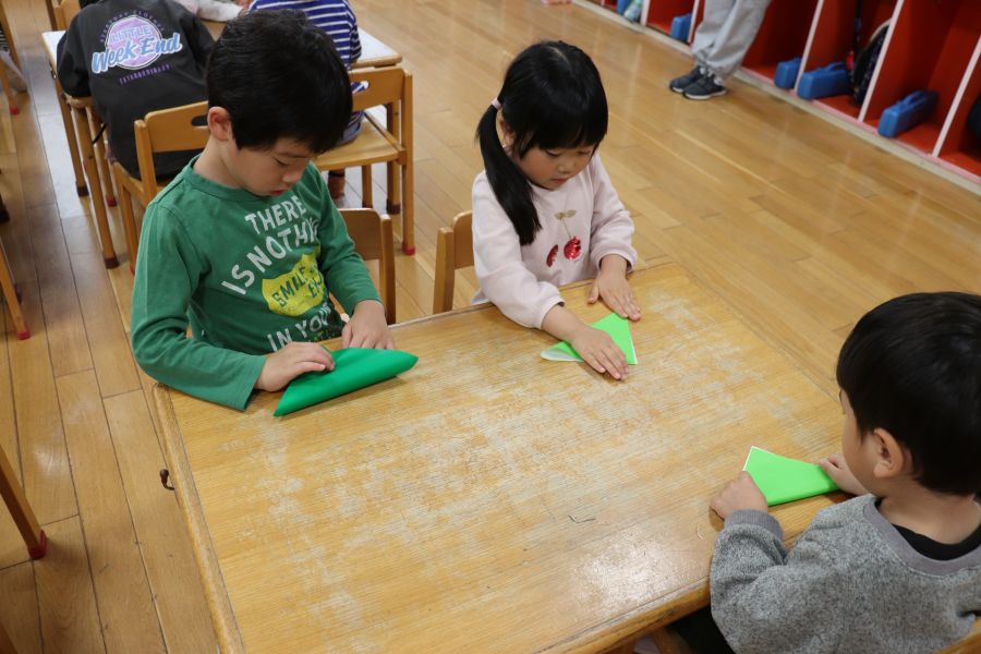 雨の日は各クラスで絵本を読んだり、折り紙をしたりして過ごしています。 4歳児クラスの桃組さんは折り紙でカエルを折っていましたよ♪ 角と角を重ねることだって上手にできます♪