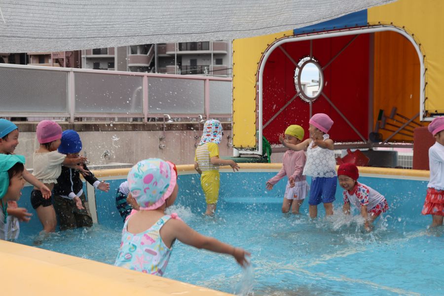今日からプール開きでした♪ 午前中はなんとかお天気ももってくれたので 気持ちよく水遊びをすることが出来ました。 乳児さんはクラス前で手作りのおもちゃを使って 楽しく遊んでいましたよ♪