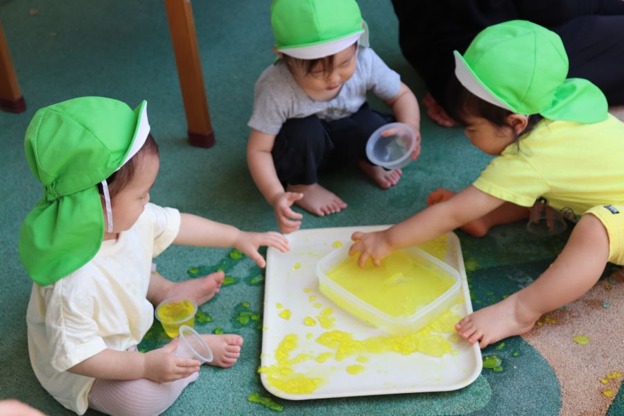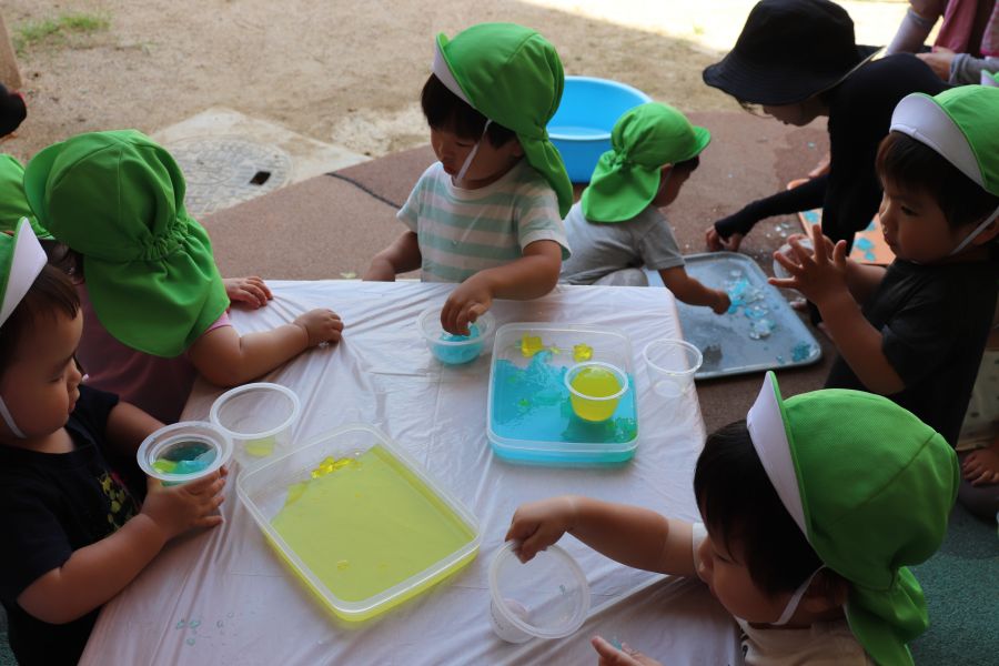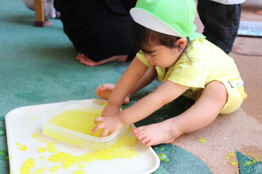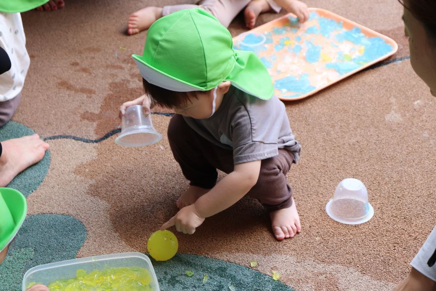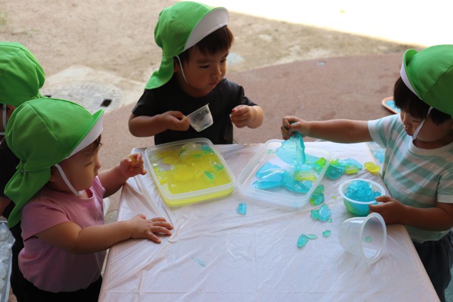 青色や黄色のきれいな寒天を最初は恐る恐る触っていたことり組のお友だち・・・ ツンツン・・触ってみると・・・冷たくて気持ちいい!! 不思議な感触にだんだんと夢中になっていましたよ 丸い形の寒天にも興味津々♪透明のカップに入れたりして楽しんでいました☆彡