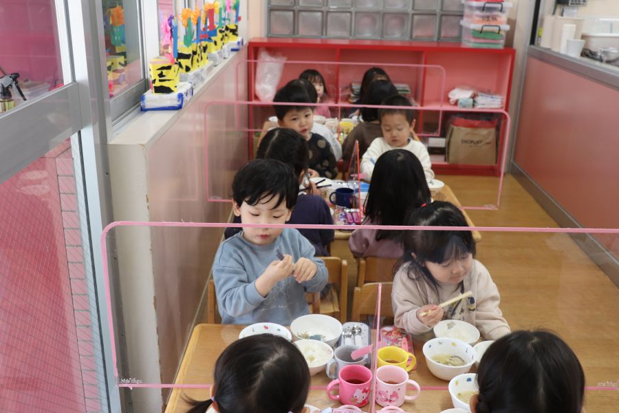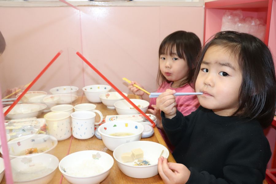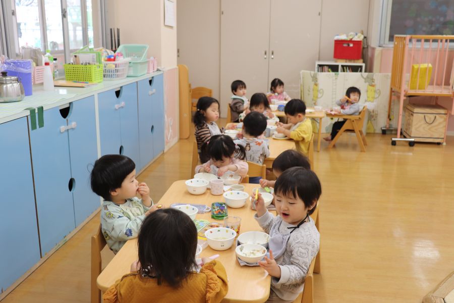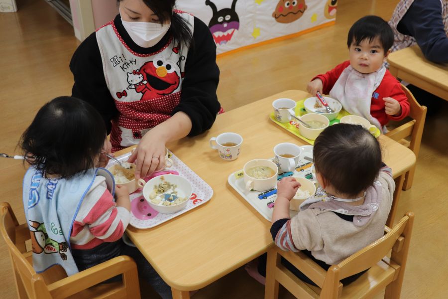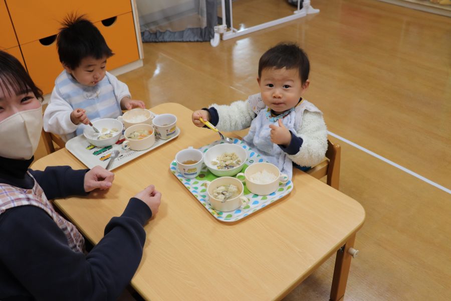 今日の給食は栄養満点★味噌ちゃんこ、高野煮、ごぼうサラダ、ごはんです! スプーンを上手に使ってパクッとおいしそう♪2歳児クラスのお友だちはお箸も上手に使えるよ♪